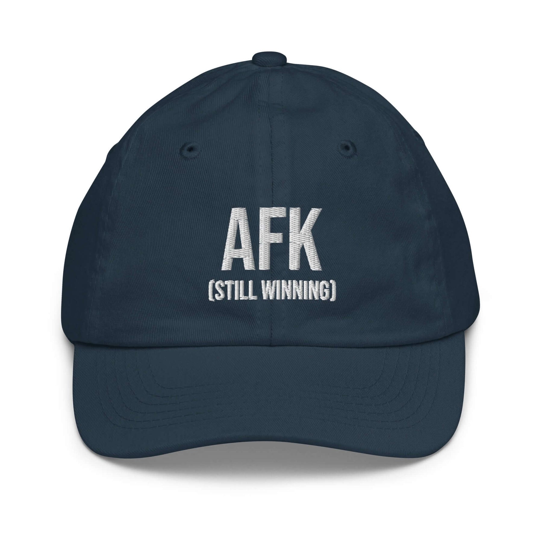 AFK Youth baseball cap in navy blue with 'AFK (STILL WINNING)' embroidered design, ideal for outdoor activities.